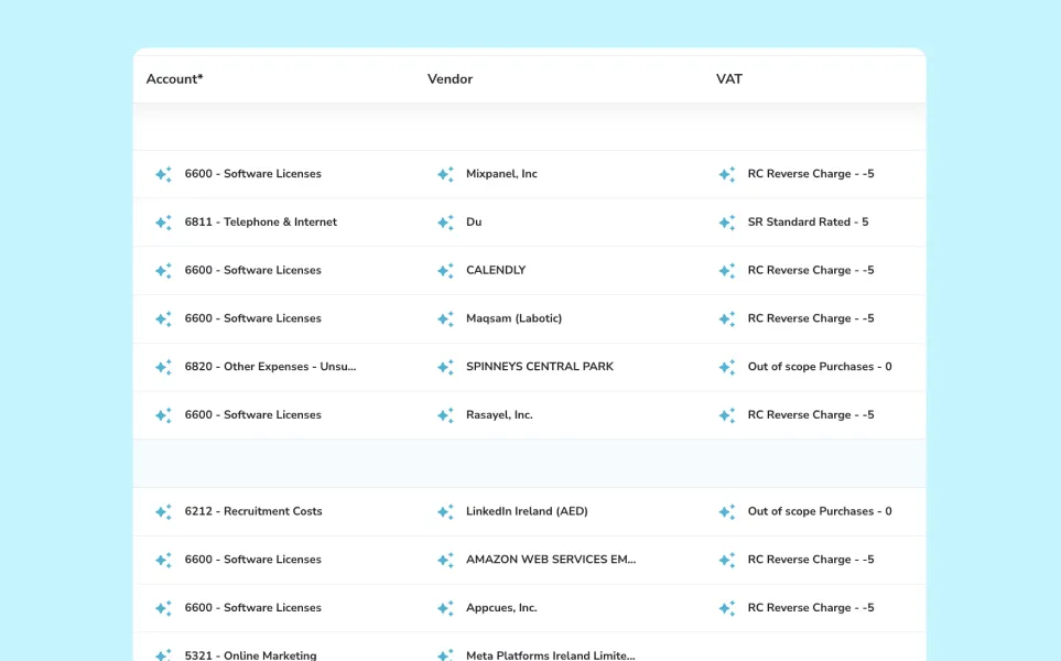 - Automatic chart-of-accounts coding on every transaction, with vendor and VAT treatment applied at the same time.