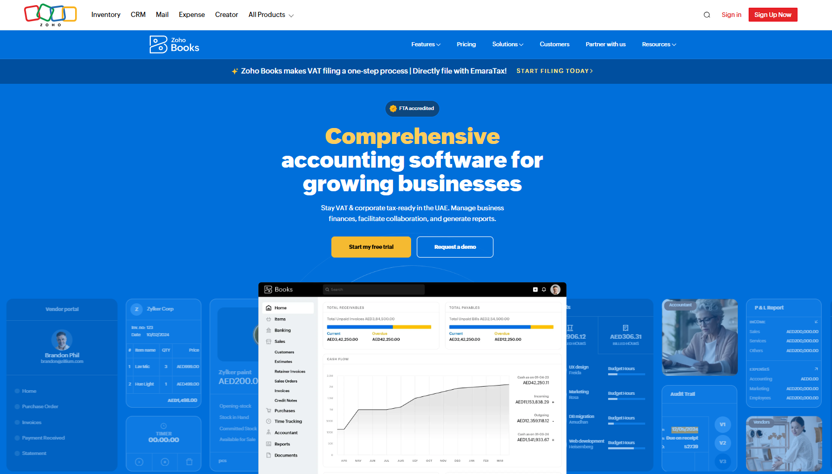 Zoho Books is a cloud accounting platform inside the broader Zoho ecosystem. It's one of the few options on this list with a fully usable free tier and FTA approval for UAE VAT and e-invoicing.