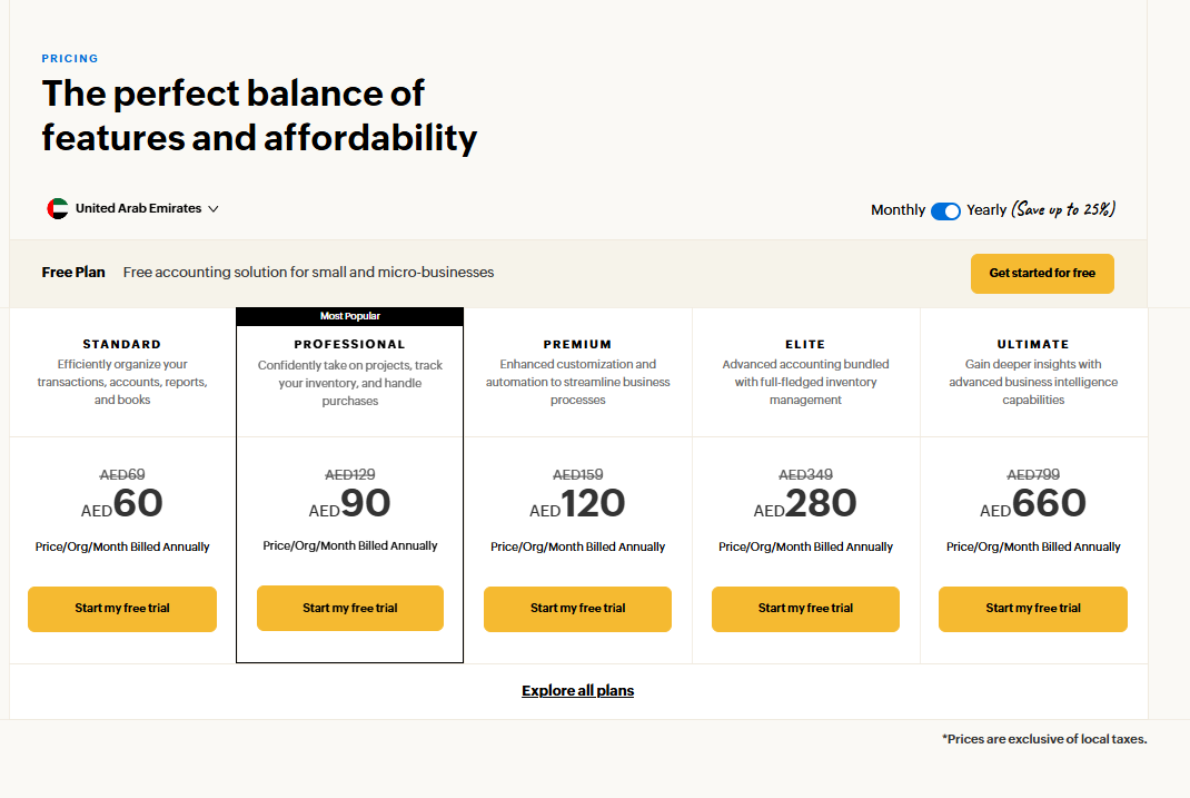 - Starter: From AED 57/month for invoicing and core bookkeeping.