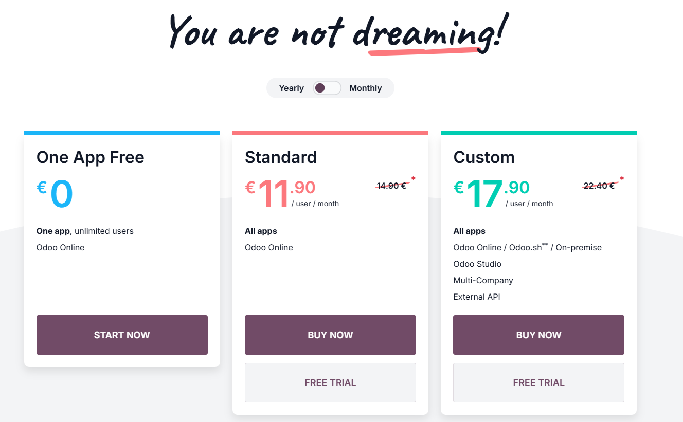 - Custom: EUR 17.90/user/month for multi-company, custom development, Odoo.sh hosting, and Odoo Studio.