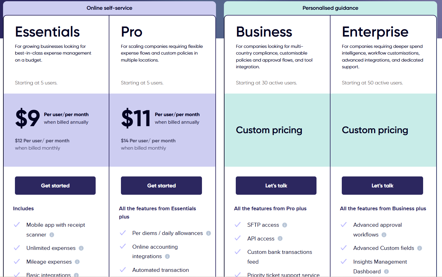 - Essentials: $9/user/month (billed annually). Mobile app with receipt scanner, unlimited expenses, and basic integrations.