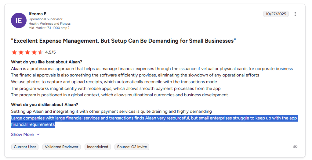 "Setting up Alaan and integrating it with other payment services is quite draining and highly demanding." - G2 Review
