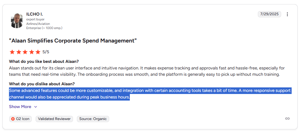 Several G2 reviewers mention that getting Alaan up and running with your existing payment tools and accounting stack takes more effort than expected.