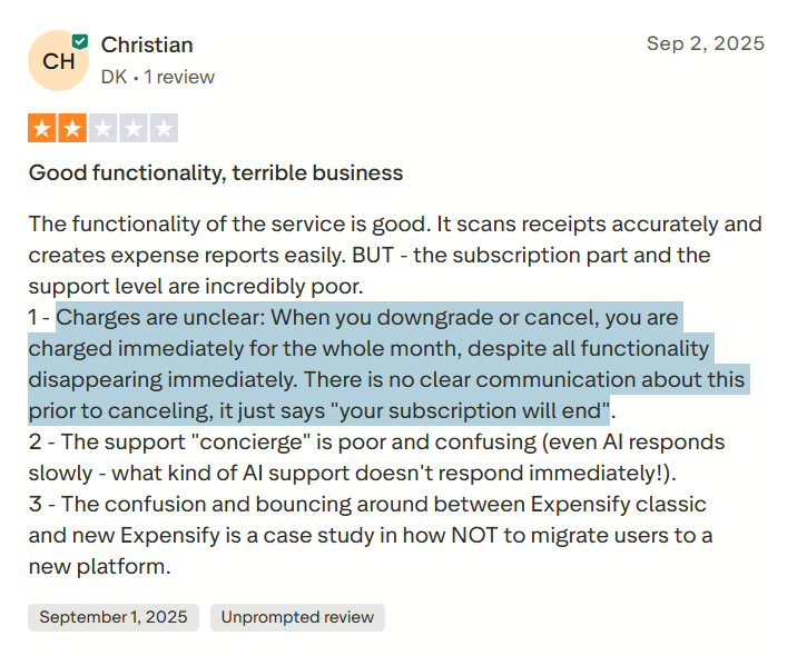 "Charges are unclear: When you downgrade or cancel, you are charged immediately for the whole month, despite all functionality disappearing immediately. There is no clear communication about this prior to canceling, it just says 'your subscription will end'." - Trustpilot Review