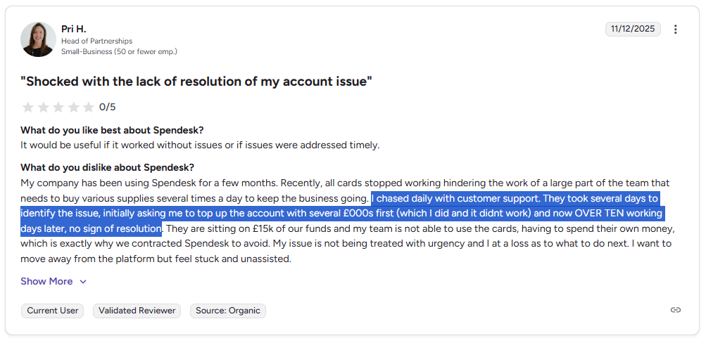 A recurring theme across both G2 and Capterra is that Spendesk cards sometimes stop working or get declined without a clear explanation.