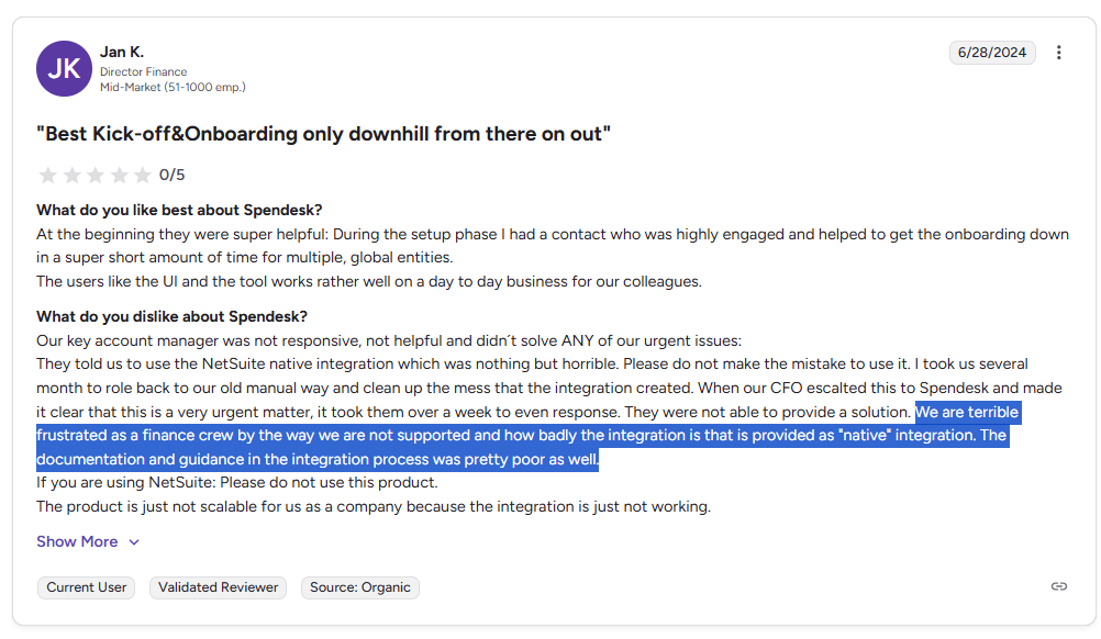 One G2 reviewer, a Director of Finance at a mid-market company, described their NetSuite integration experience in detail and noted it took months to roll back to manual processes after the integration caused issues.